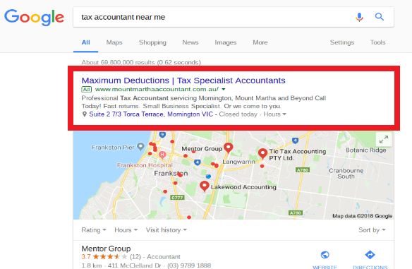 To illustrate how local search works, let’s Google ‘tax accountant near me’. The search engines (mainly Google in this country) will assume